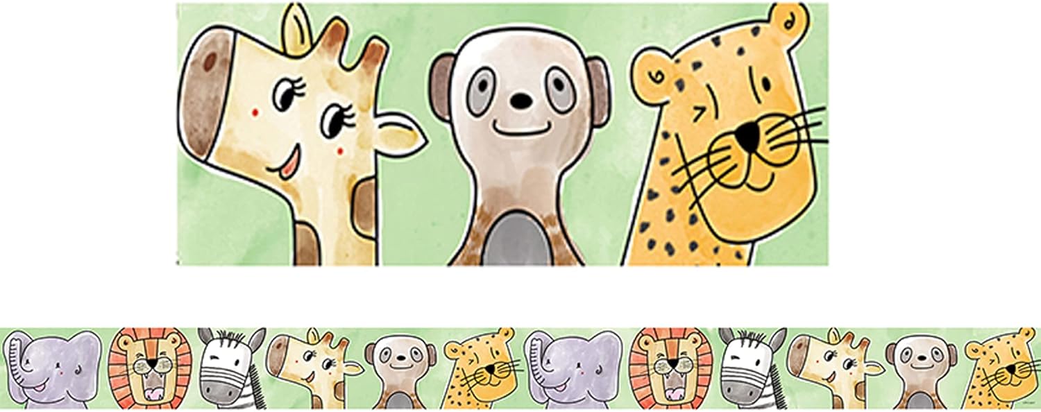 - This bulletin board border features colorful Safari animals (Cheetah, meerkat, giraffe, Zebra, lion, and elephant) on a leafy green background